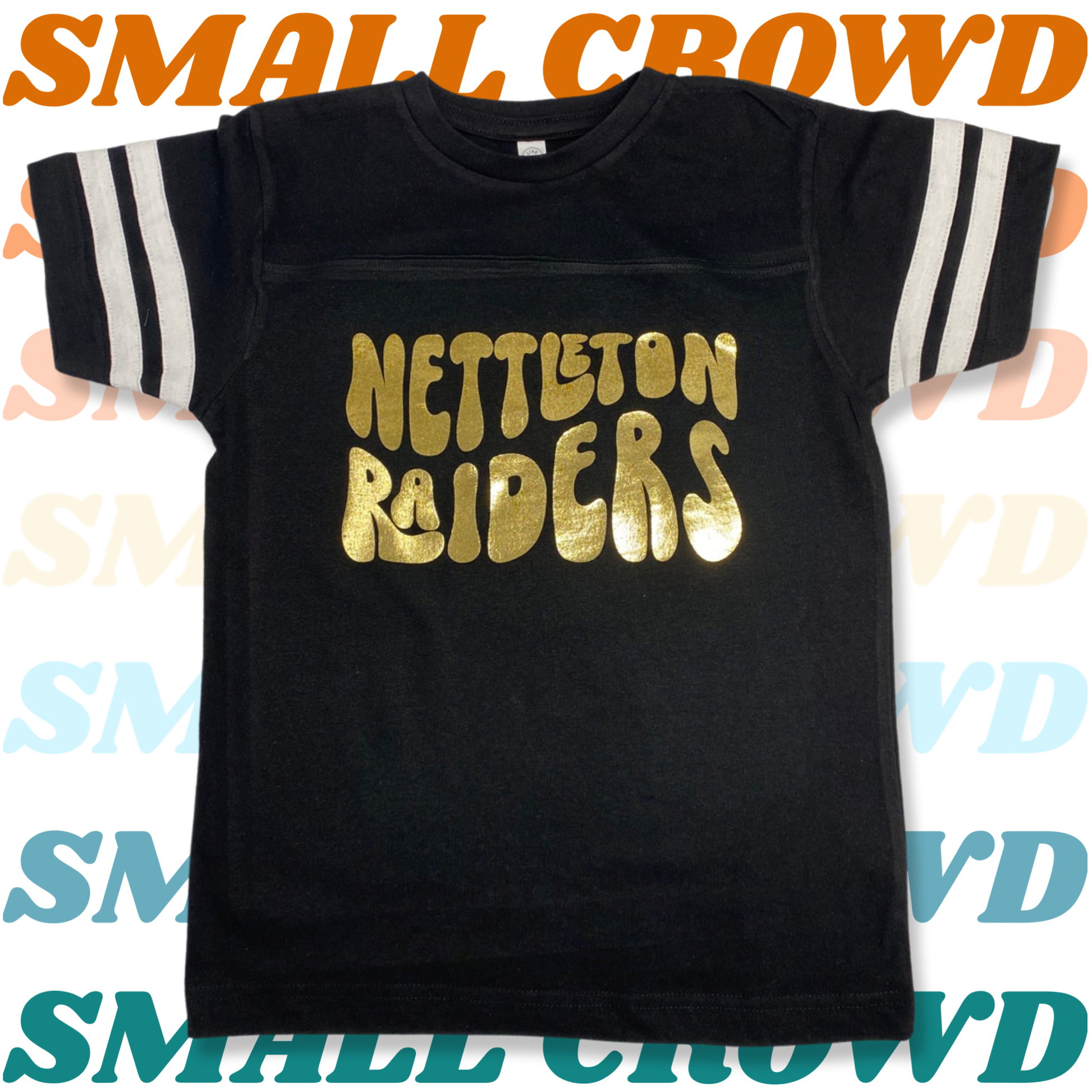 All Small Crowd customizable tees are available with nearly any name or phrase. We reserve the right to cancel any order with inappropriate, offensive or simply trademarked phrase, team, etc.